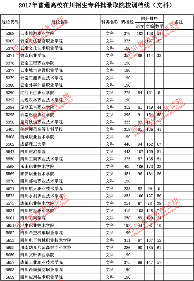 2017年普通高校在川招生专科批录取院校调档线