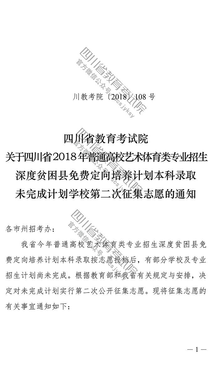 关于四川省2018年普通高校艺术体育类专业招生深度贫困县免费定向培养计划本科录取未完成计划学校第二次征集志愿的通知