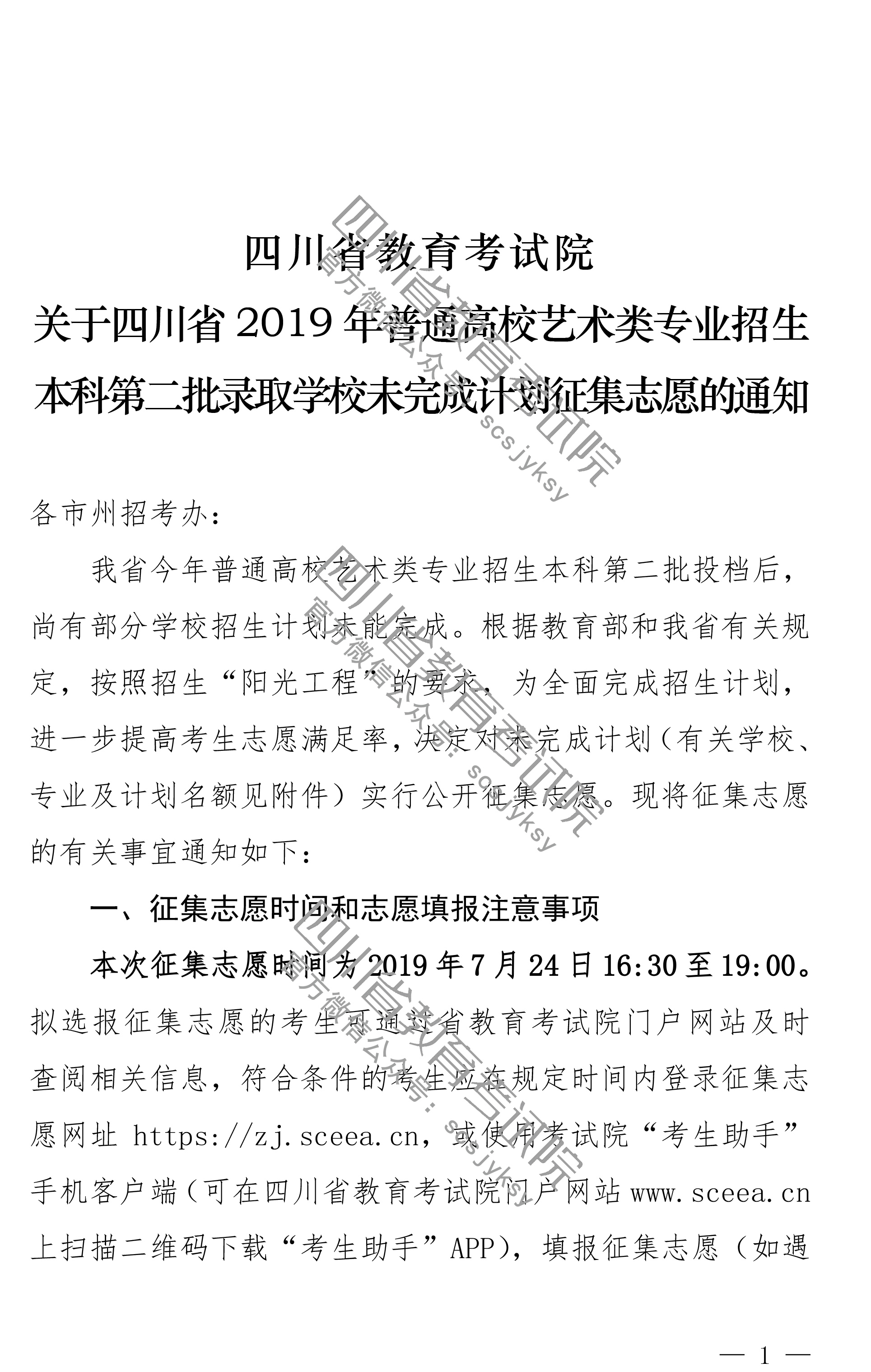 关于四川省2019年普通高校艺术类专业招生本科第二批录取学校未完成计划征集志愿的通知