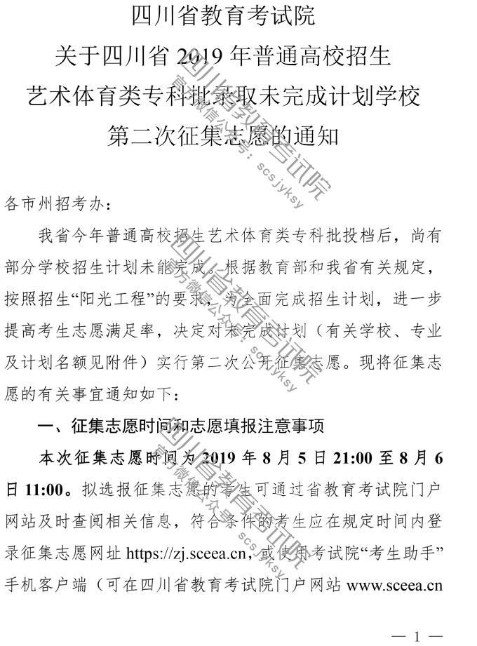 关于四川省2019年普通高校招生艺术体育类专科批录取未完成计划学校第二次征集志愿的通知