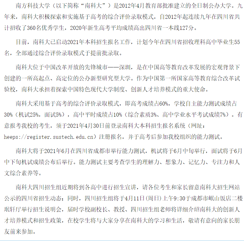 南方科技大学4月11日在成都举行招生说明会,2021年计划在穿招生55人