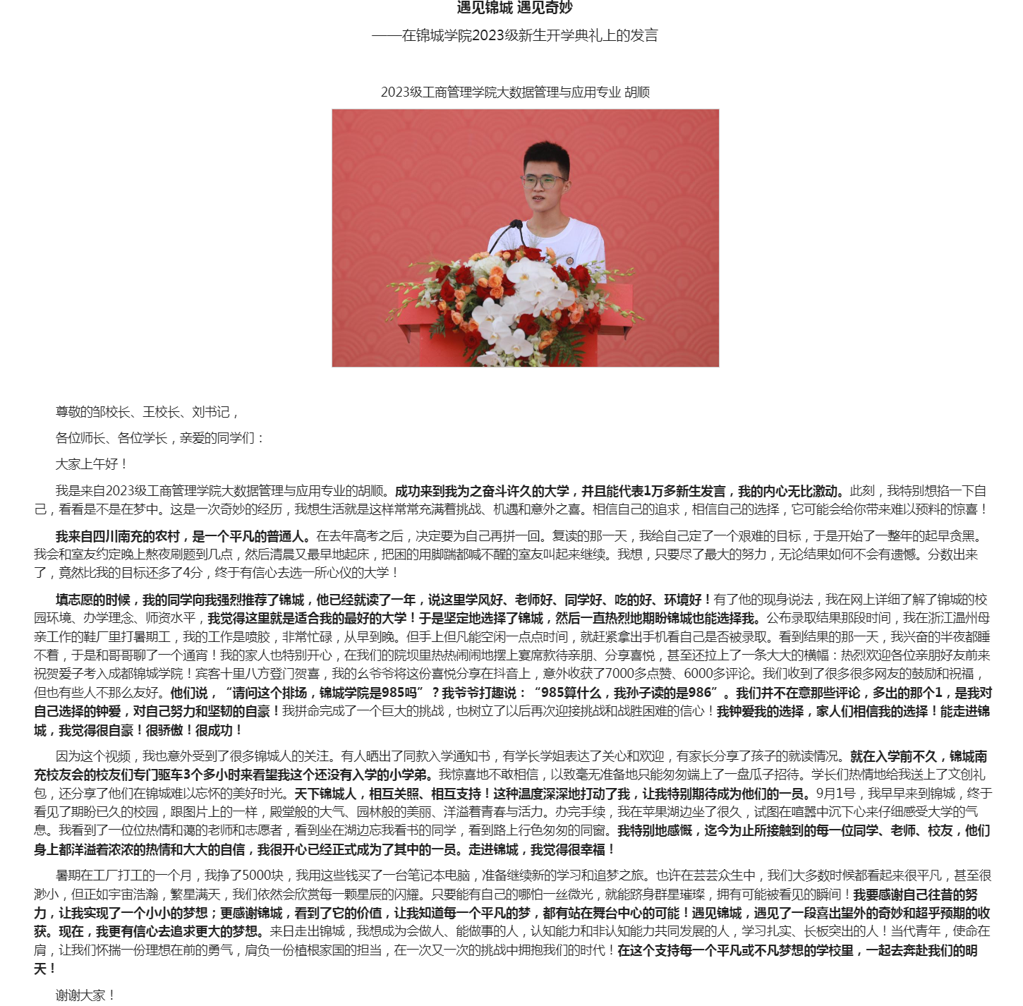 遇见锦城 遇见奇妙——在成都锦城学院2023级新生开学典礼上的发言